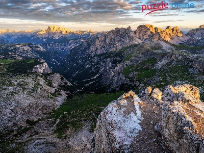 Dolina, Góry, Wschód słońca, Dolomity, Włochy, Skały