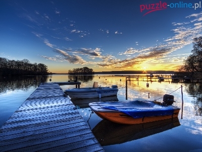 Słońca, Motorówki, Jezioro, Wschód, Pomost