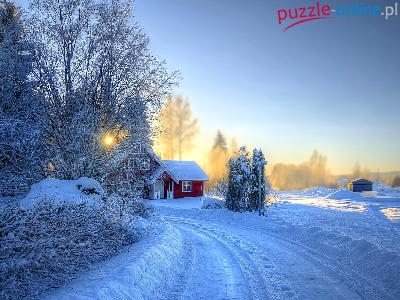 Wschód słońca, Droga, Drzewa, Zima, Dom, Pole