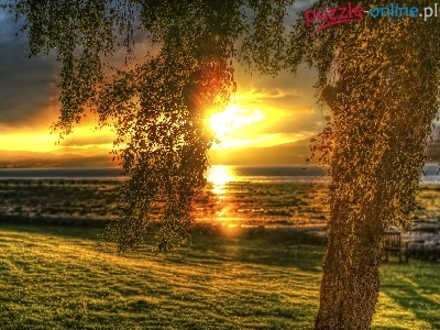 Puzzle Łąka, Zachód, Słońca, Drzewo