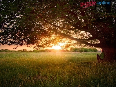 Puzzle Słońca, Łąka, Zachód, Drzewo