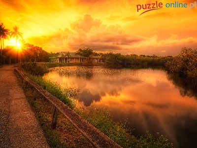 Słońca, Jezioro, Dom, Chmury, Zachód, Palma