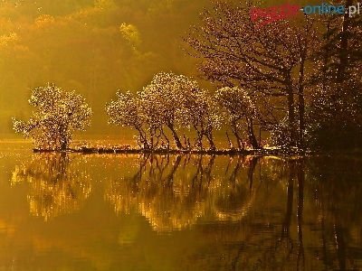 Zachód Słońca, Drzewa, Odbicie, Jezioro, Wyspa, Jesień
