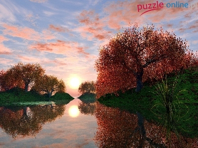 Puzzle Słońca, Jezioro, Zachód, Drzewa