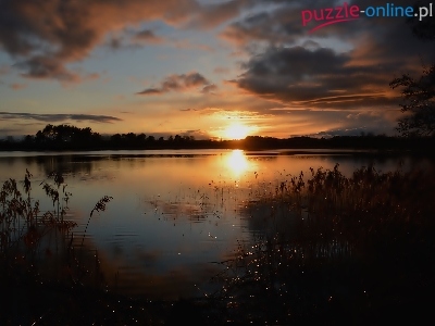Słońca, Rośliny, Jezioro, Zachód, Chmury