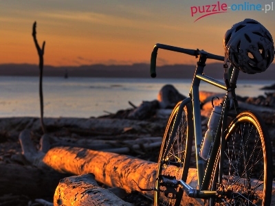 Zachód Slońca, Kask, Drzewo, Rower, Wybrzeże, Jezioro