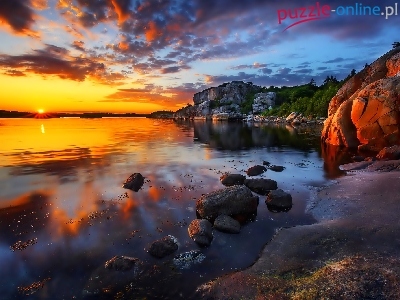 Słońca, Skały, Kamienie, Morze, Zachód, Chmury