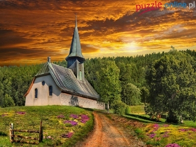 Puzzle Słońca, Kościół, Zachód, Drzewa