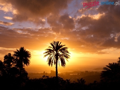 Słońca, Chmury, Miasta, Palmy, Zachód, Panorama