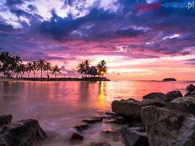 Słońca, Palmy, Morze, Zachód, Kamienie