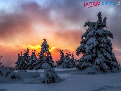 Zachód słońca, Sauerland, Świerki, Niemcy, Zima, Śnieg
