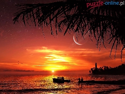 Puzzle Łódka, Zachód, Słońca, Morze