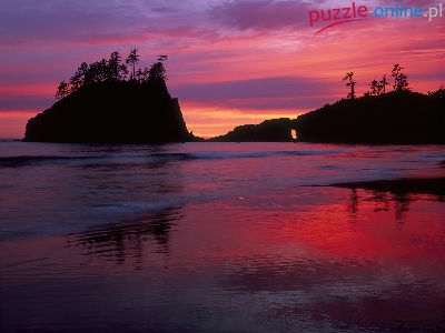 Słońca, Drzewa, Plaża, Zachód, Skały