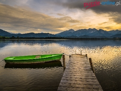 Zachód słońca, Łódź, Chmury, Jezioro, Góry, Pomost