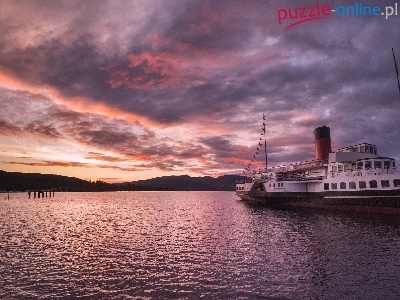 Zachód słońca, Park Narodowy Loch Lomond and the Trossachs, Parowiec PS Maid of the Loch, Szkocja, Jezioro Loch Lomond, Statek