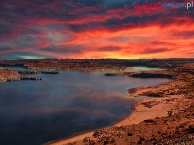 Słońca, Chmury Rzeka, Wybrzeże, Zachód, Niebo