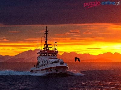 Słońca, Ptak, Statek, Zachód, Morze
