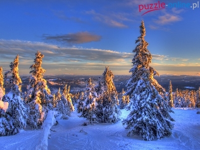 Puzzle Świerki, Zachód, Słońca, Zima
