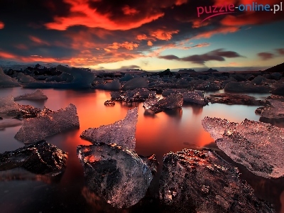 Zachód słońca, Lód, Islandia, Jezioro Jokulsarlon, Zima