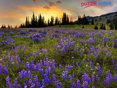 Słońca, Promienie, Łubin, Łąka, Zachodzącego, Drzewa