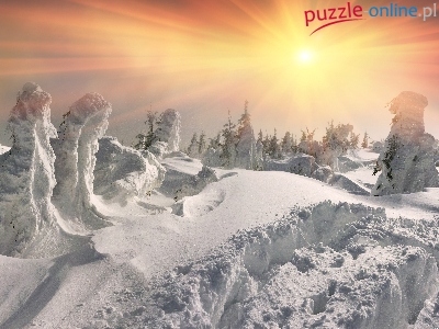 Puzzle Świerki, Zima, Promienie słońca, Zaspy