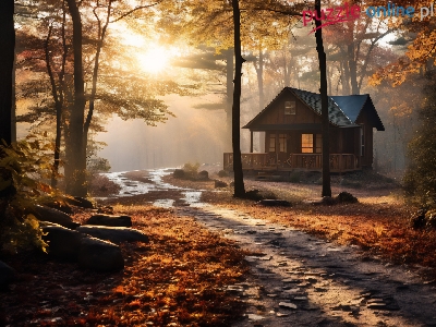 Dom, Jesień, Droga, Słońce, Las, Drzewa, Chata