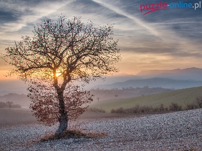 Samotne, Słońce, Drzewo, Wzgórza, Pole
