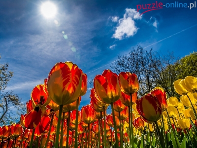 Puzzle Słońce, Tulipany, Niebo, Wiosna