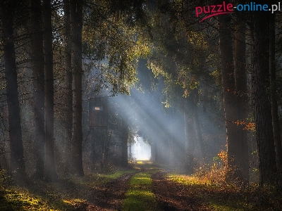 Las, Droga, Drzewa, Smugi, Przebijające światło