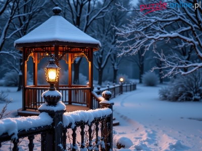 Śnieg, Noc, Zima, Park, Ogrodzenie, Ośnieżone, Drzewa, Altana, Lampion