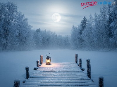 Śnieg, Zima, Mgła, Księżyc, Ośnieżone, Pomost, Latarnia, Drzewa, Jezioro, Zaśnieżone