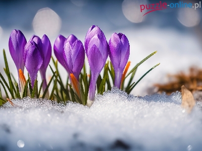 Puzzle Krokusy, Kępka, Kwiaty, Śnieg