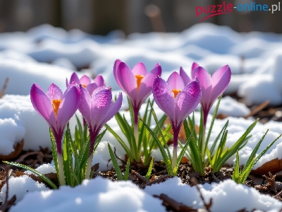 Puzzle Krokusy, Fioletowe, Rozświetlone, Śnieg
