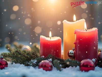 Bombki, Boże Narodzenie, Gałązki, Grafika, Świece, Stroik, Śnieg