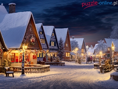 Latarnie, Zima, Choinki, Boże Narodzenie, Światła, Śnieg, Noc, Ulica, Domy, Miasto