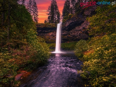 Wodospad, Oregon, Stany Zjednoczone, Park stanowy, South Falls, Zachód słońca, Skały, Silver Falls State Park, Drzewa