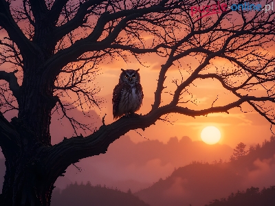 Puzzle Konar, Sowa, Drzewo, Zachód słońca