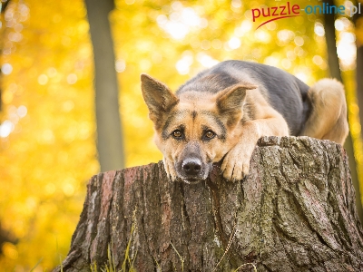 Pies, Spojrzenie , Drzewa, Niemiecki, Jesień, Owczarek, Pień