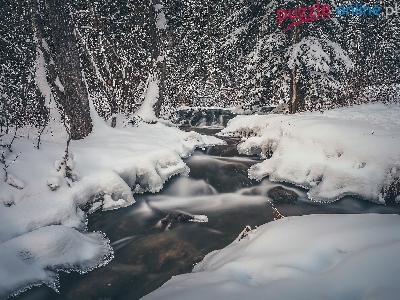 Park Prowincjonalny Big Hill Springs, Prowincja Alberta, Zima, Śnieg, Rzeka, Strumień, Kanada, Las, Drzewa