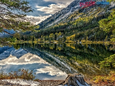 Stan Montana, Jezioro Pray Lake, Odbicie, Góry, Stany Zjednoczone, Park Narodowy Glacier, Świerki
