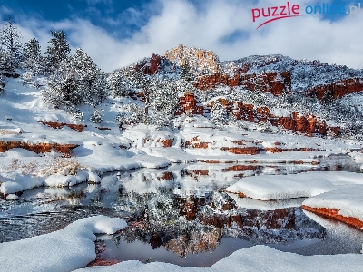 Zima, Skały, Rzeka Oak Creek, Stan Arizona, Park Stanowy Slide Rock, Wąwóz Oak Creek Canyon, Stany Zjednoczone, Kanion