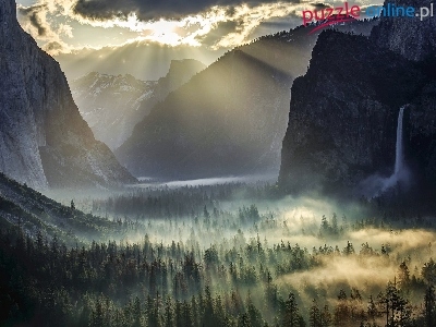 Stan Kalifornia, Wschód słońca, Wodospad, Park Narodowy Yosemite, Las, Stany Zjednoczone, Góry, Mgła