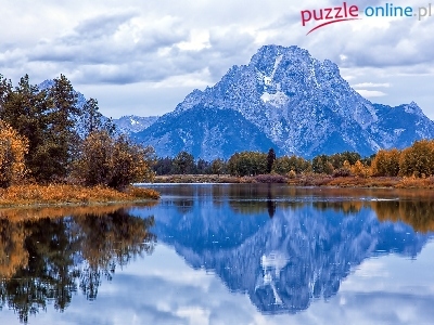 Stan Wyoming, Szczyt Mount Moran, Drzewa, Park Narodowy Grand Teton, Jesień, Stany Zjednoczone, Jezioro Jackson Lake, Góry