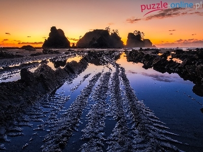 Stan Waszyngton, Hrabstwo Clallam, Skały, Morze, Park Narodowy Olympic, Piasek, Plaża Shi Shi Beach, Stany Zjednoczone, Zachód słońca