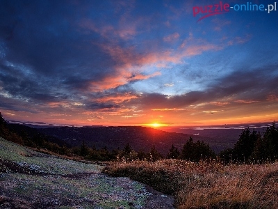 Zachód słońca, Stan Maine, Wzgórza, Stany Zjednoczone, Park Narodowy Acadia, Drzewa