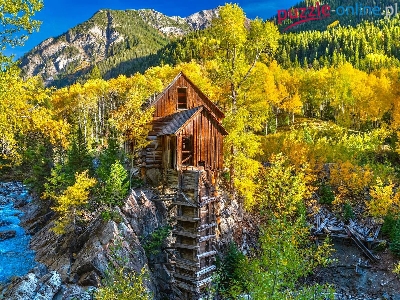 Drzewa, Młyn, Kolorado, Stany Zjednoczone, Jesień, Crystal Mill, Rzeka, Skały, Góry, Crystal River