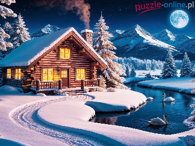 Drzewa, Grafika, Księżyc, Dom, Śnieg, Łabędzie, Zima, Staw