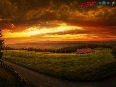 Stodoła, Góry, Zachód Słońca, Droga, Ławka