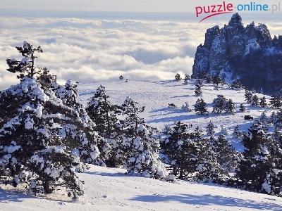 Puzzle Stok, Góry, Chmury, Choinki