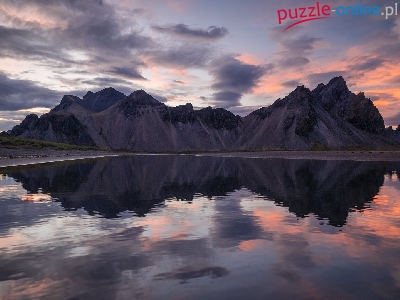 Odbicie, Poranek, Morze, Islandia, Vestrahorn, Góry, Plaża Stokksnes